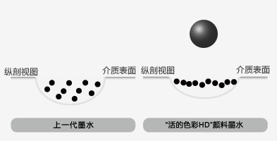 粗面黑色墨水的化学性质更适合在粗面类介质上输出,相比前一代粗面黑色颜料墨水,粗面黑色墨水中的颜料颗粒更多的停留在粗面类介质的表层,而不是向介质内部渗透,从而获得更高的黑密度值。